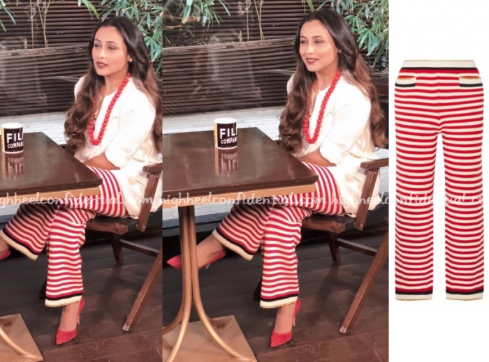 To promote her upcoming movie Hichki, Rani sat down with Anupama Chopra for an interview where she was seen wearing Gucci pants with a white kurta and red pumps. If going for jewellery, I wish Rani had worn the combo with some of Gucci’s quirky stuff instead of that giant bead necklace. It just felt so out of place.