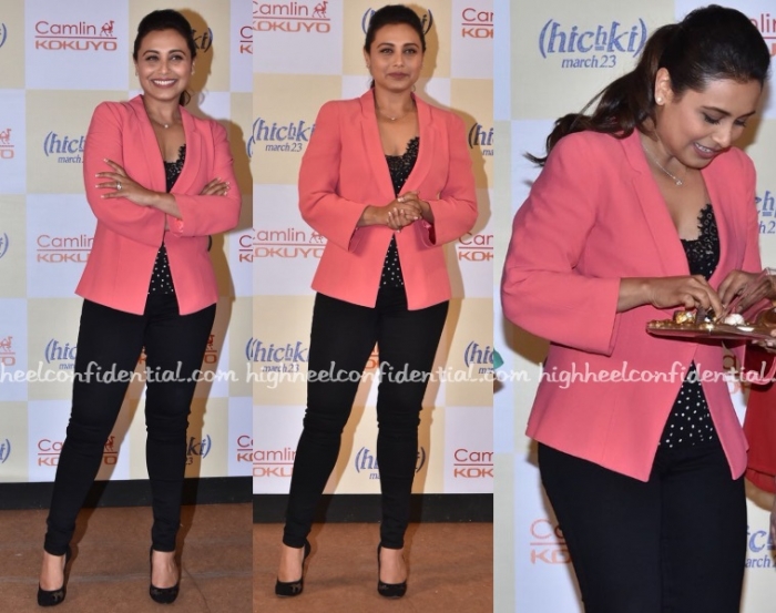 At Hichki promotions on Saturday, Rani was seen in a black lace cami paired with a pink blazer, denims and pumps. While she looked nice, I did feel like she could’ve used a different color lipstick.