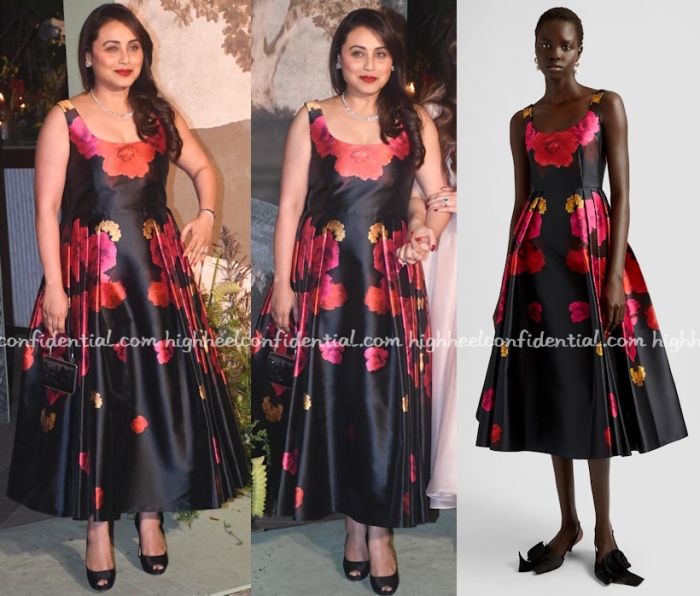 Rani attended a friend’s birthday celebrations on Wednesday evening wearing a floral print Erdem dress paired with black peep-toe pumps and a micro bag. A skinny belt would’ve help define the waist a bit more but overall she looked nice.