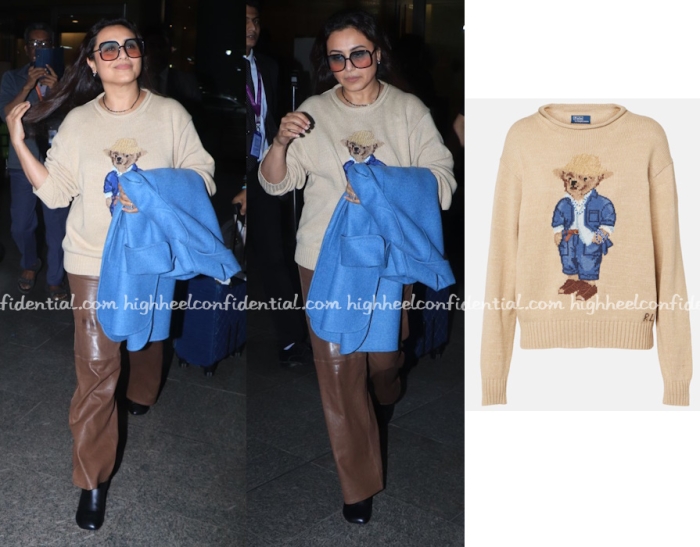 Rani was spotted arriving back in Mumbai wearing a Ralph Lauren sweater with brown faux? leather pants and a blue wool coat. Like the outfit?