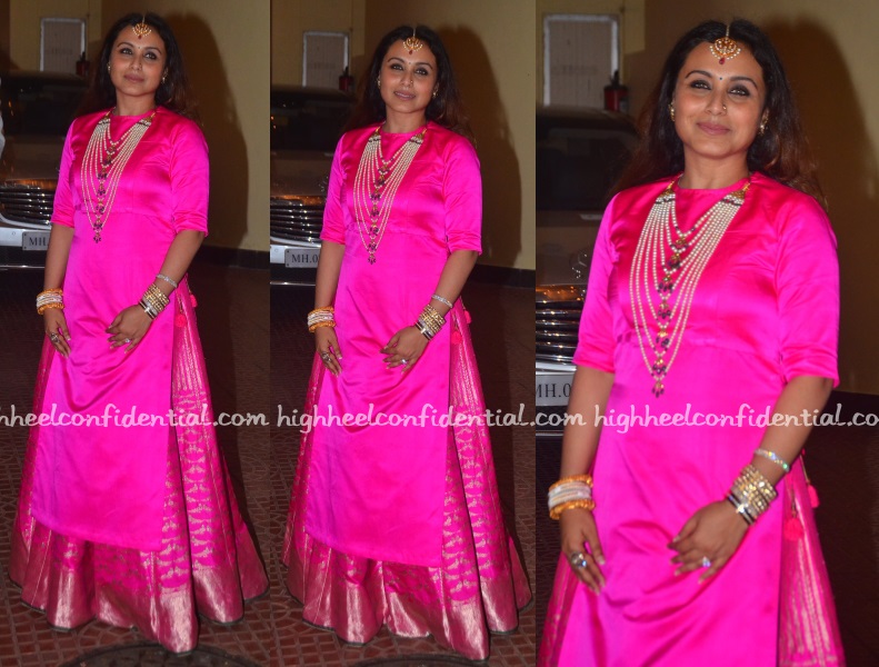 Rani picked a hot pink Raw Mango lehenga to wear to her Diwali party pairing it with with a layered satlada necklace, maang tikka and stack of bangles on each hand.
