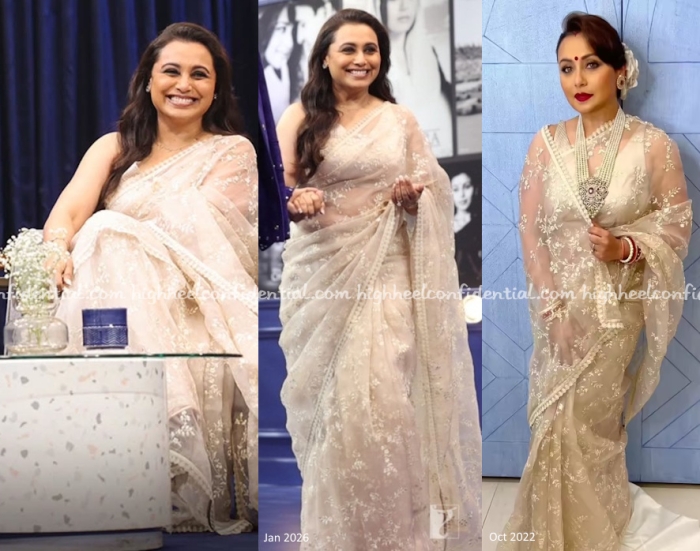 As part of promotions for her upcoming movie, Rani sat down with Karan Johar for a special talk session celebrating also her 30 years in the industry. Instead for a new outfit, the actress chose to re-wear her Sabyasachi sari that she was seen in at Ashtami celebrations in 2022.