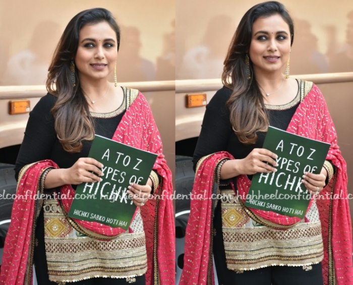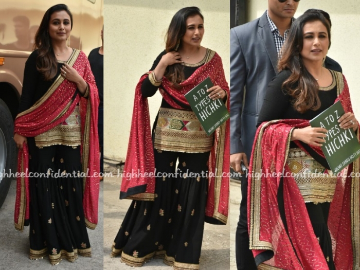 Promotions for Hichki on Tuesday saw Ms. Mukerji in a black Sabyasachi gharara, one that she looked lovely in. Agree?