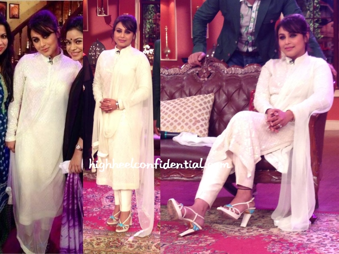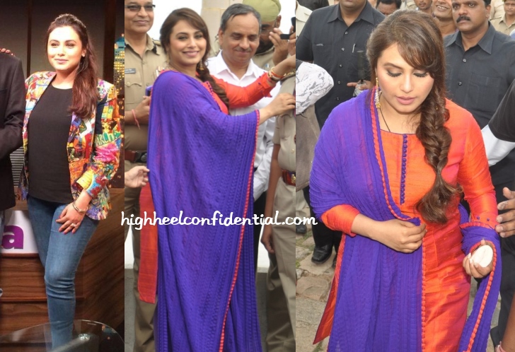 For Mardaani promotions, the actor donned two desi looks and one casual denim look featuring a Diva’ni blazer. Her white look wasn’t bad but those jewelled Dior sandals killed the look instead of elevating it.