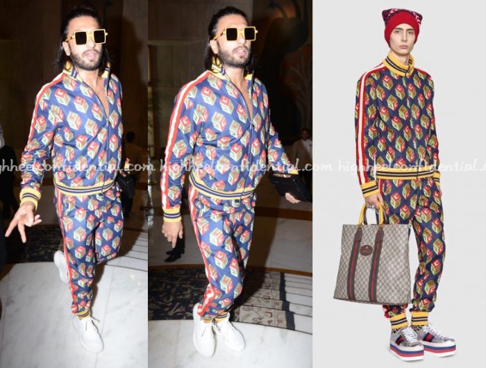 In Delhi to walk for Manish Malhotra’s show at the India Couture Week, Ranveer was seen arriving at the venue wearing the brand’s 3D logo wallpaper print separates with yellow-rimmed square glasses and white sneakers.