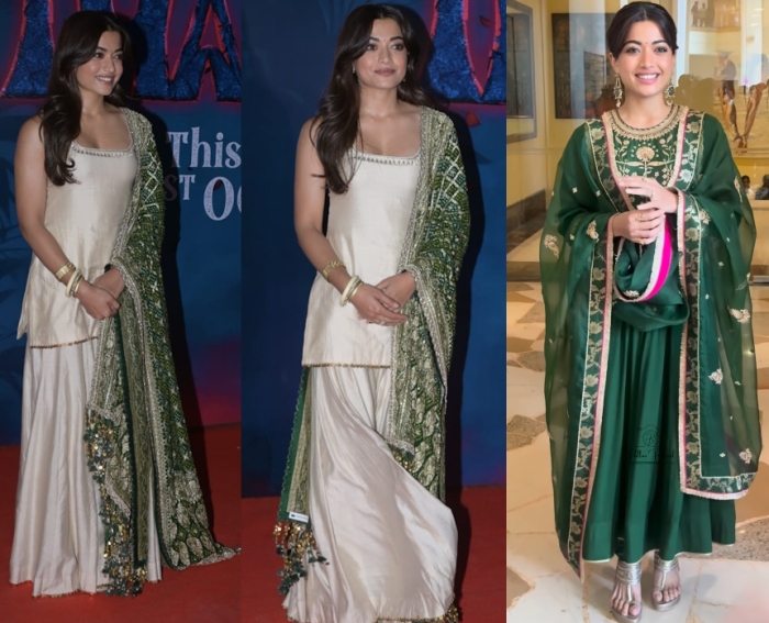 In Twos By Payal October 24, 2025 The Daily Etcetera 0 Two outings for promotions of her movie saw Rashmika doing shades of green, first in a cream Anjana Bohra sharara featuring a bandhani dupatta and then an all-green churidaar kurta. Have a preference? Rashmika Mandanna Photo Credit: Instagram Tags: anjana bohra, meagan concessio, Rashmika Mandanna, thamma promotions Like it? Share it! Previous Article Sari Style Next Article In Zuhair Murad