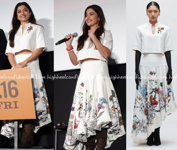 Rashmika visited Japan recently to attend a screening of a movie and was seen wearing an embroidered top and skirt set from Chorus paired with brown suede boots. Not a big fan of bubble hem skirt but she looked nice in the set nevertheless. Simple and fussfree.