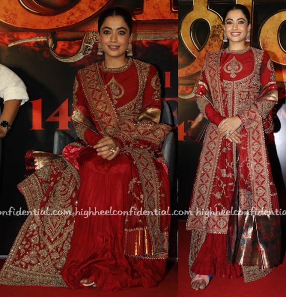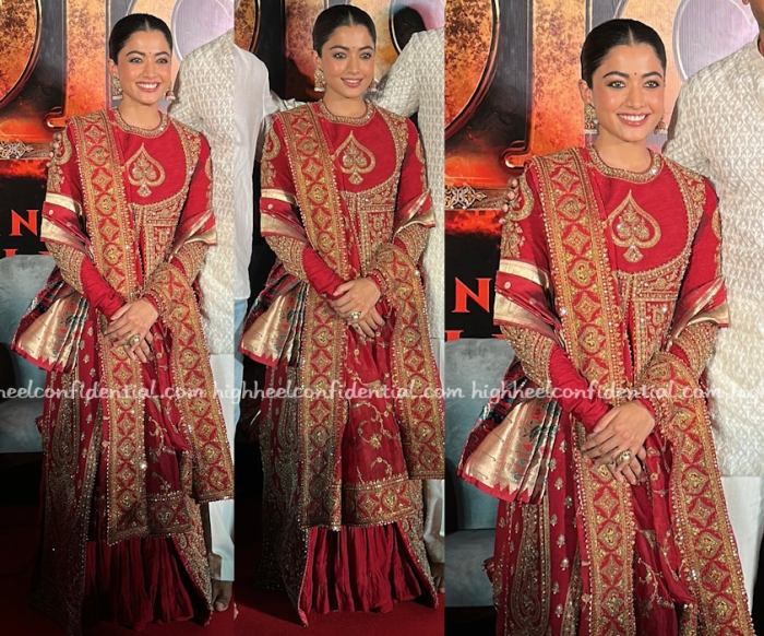 Rashmika attended the trailer launch of her upcoming movie wearing a red ornate anarkali sharara from Torani. Since she plays a Maratha queen, she also had a paithani dupatta around her hand.