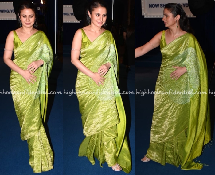 Rasika opted for a lime green tie-dye sari from Medium to wear to the trailer unveiling of her series turned movie. From what I see, I like.
