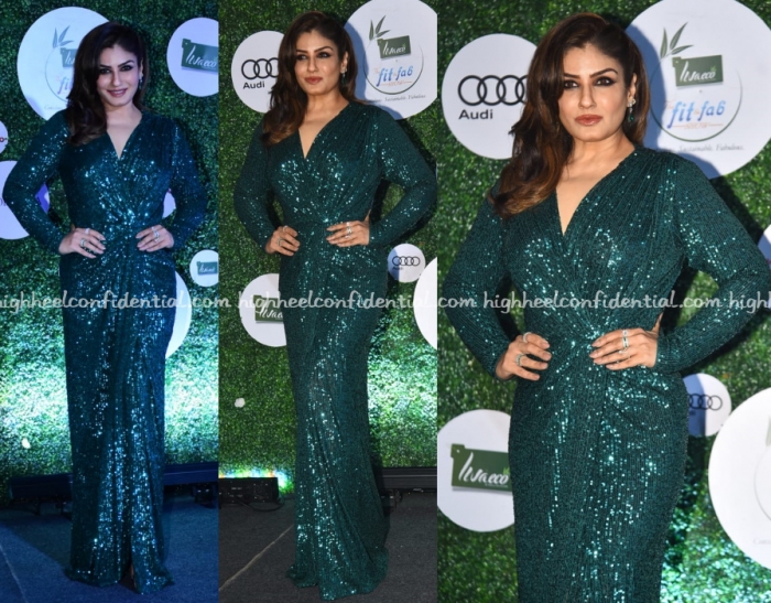Raveena attended an awards ceremony Thursday evening wearing a full-sleeve sequin gown with emerald and diamond jewellery. She looked good!