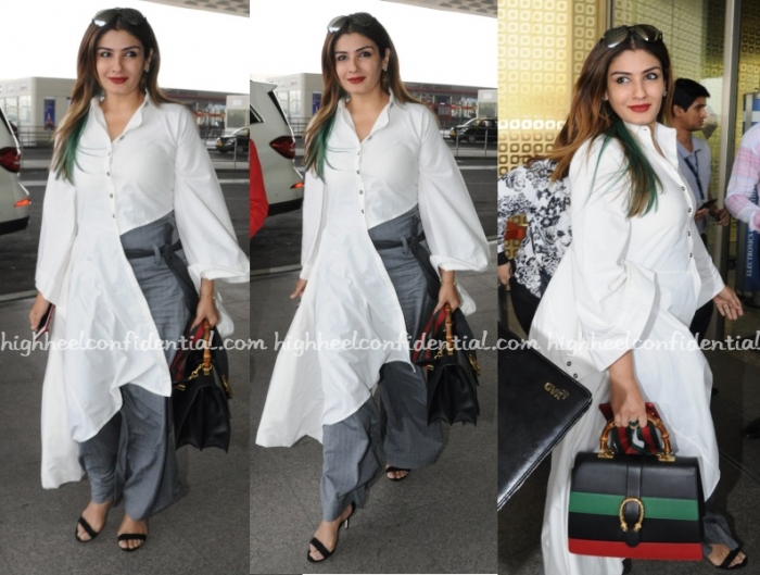 Raveena travelled out of Mumbia on Saturday morning wearing separates from Chola with black sandals and a Gucci bamboo handle ‘Dionysus’ bag.