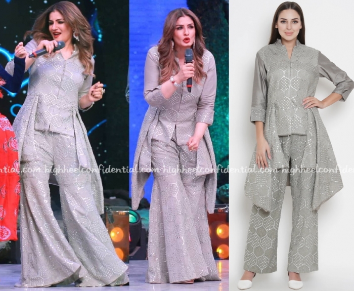 Raveena taped for a Bengali reality dance show recently and was seen wearing mirrorwork separates from Twenty Nine. Pairing that jacket with the longer sharara was a good move as it balanced out the look. Having said that though, can’t say am a fan of the jacket itself.