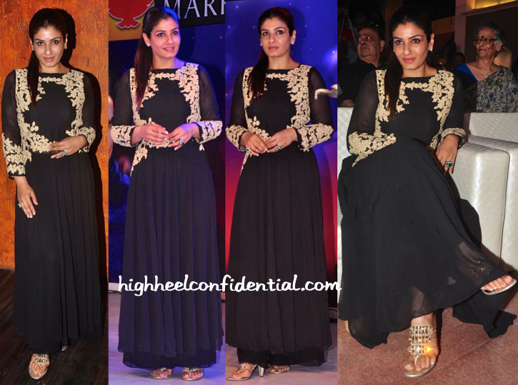 Ms. Tandon inaugurated a dance competition in Mumbai yesterday wearing a black suit featuring ivory embroidery. With her hair pulled back in a ponytail, she finished out the look with discreet earrings, cocktail rings and a pair of metallic sandals. She looked good! (The heels were a downer though! We’ll just have to pretend we don’t see them.)