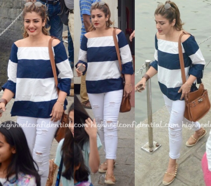 As she was out and about in Mumbai, Raveena was photographed in navy and white separates. With her hair pulled back in to ponytail, she rounded out the look with a striking red lip and tan accessories that included an Hermès ‘Jypsiere’ bag.