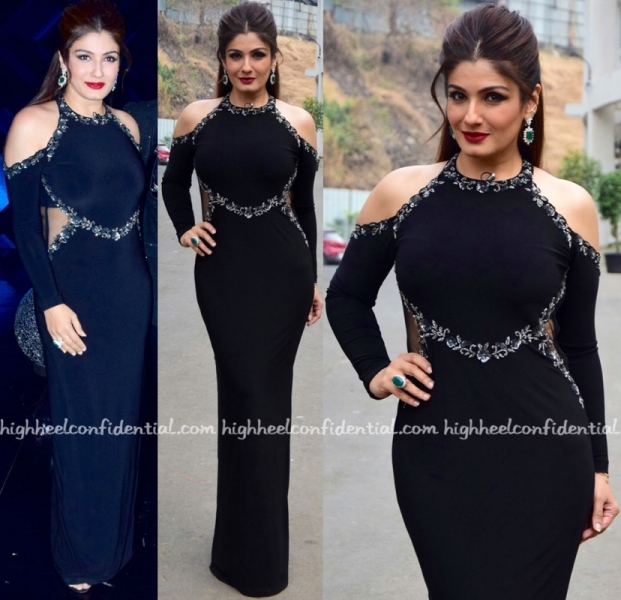 For her appearance on the sets of a reality show, Raveena picked a gown that featured cut-outs. A strong red lip and diamond jewelry rounded out her look.