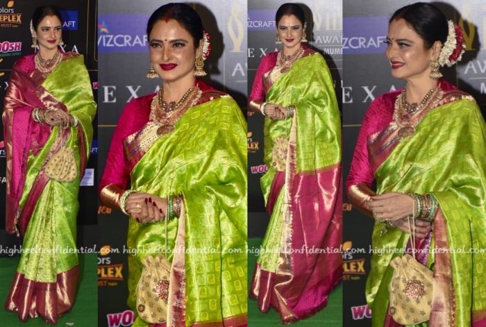 Wearing a kanjeevaram sari, Rekha attended IIFA Awards in Mumbai last evening. Staying on course, she rounded out the look with flowers, serious bling and an embellished potli. Excessive but a hundred percent on brand.