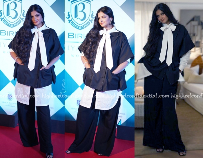 Rhea attended an event last week wearing separates from Rishta By Arjun Saluja. While I like each of the pieces individually, the additional line the hem of the black jacket added just threw off proportions. Oddly, the stylist also shared a pic which had Rhea tucking her hands in the pant pockets and the shirt riding up as a result made it look better.