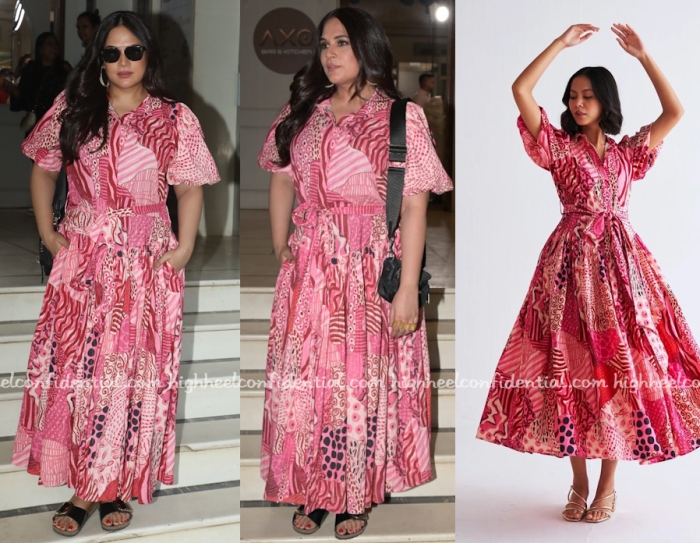 Richa attended the screening of a movie that she helped produce wearing a printed wrap dress from Ritu Kumar paired with a red shoulder bag and black sandals. She was also seen in another printed dress from Drawn while attending a round table talk a week earlier which she walked more casually with birkenstock sandals. Catch it inside.