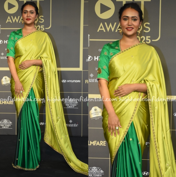 Saanvika attended an awards event wearing a green and lemon yellow sari from Raw Mango with her hair up in an updo and red lips. She looked lovely in it.