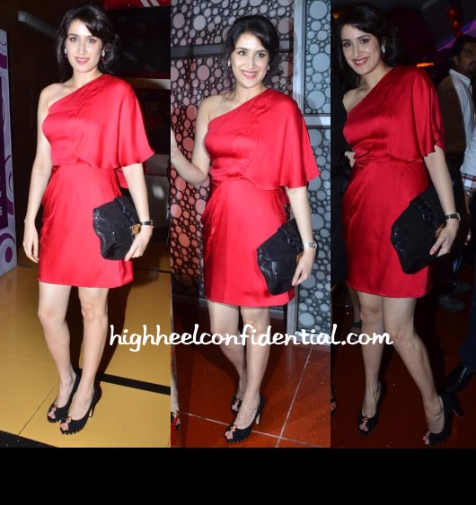 Sagarika kept it simple in a red one-shouldered dress at the premiere of her movie pairing it with a black clutch and black McQueen pumps.