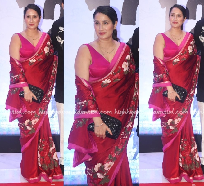 Sagarika attended a screening wearing a hand-painted sari from her own label, Akutee, paired with a pink blouse and a black patent clutch. The black was too jarring against the red but am more disappointed by the drape.
