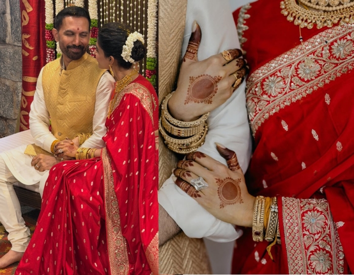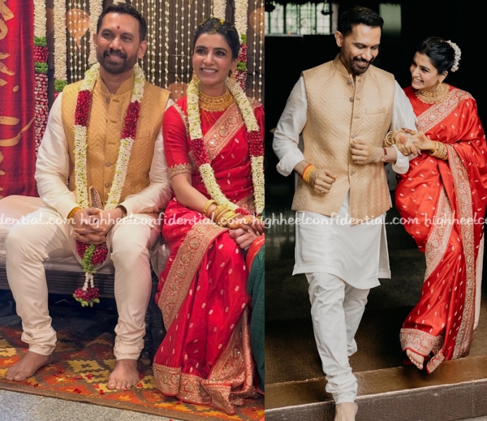 Samantha and Raj tied the knot today in Coimbatore with the bride wearing a benarasi sari embellished by Arpita Mehta with a blouse designed by Jayati Bose and the groom wore a kurta and jacket set from Tarun Tahliani .