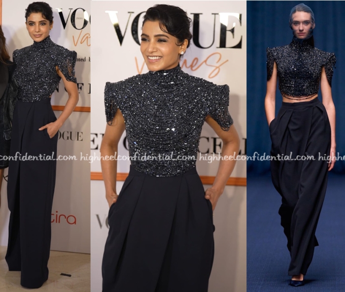 Samantha was recognized at a women centric event hosted by Vogue and was seen wearing a runway look from (no points for guessing) Kresha Bajaj. Her finishing touches her with that hairdo elevated this look.