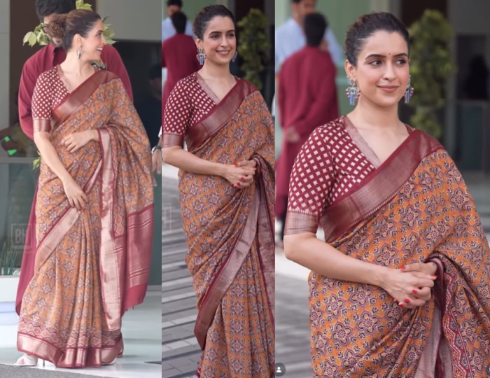 Wearing a block print sari that had a traditional border, Sanya attended promotions for her upcoming movie on Monday. She looked lovely in it.