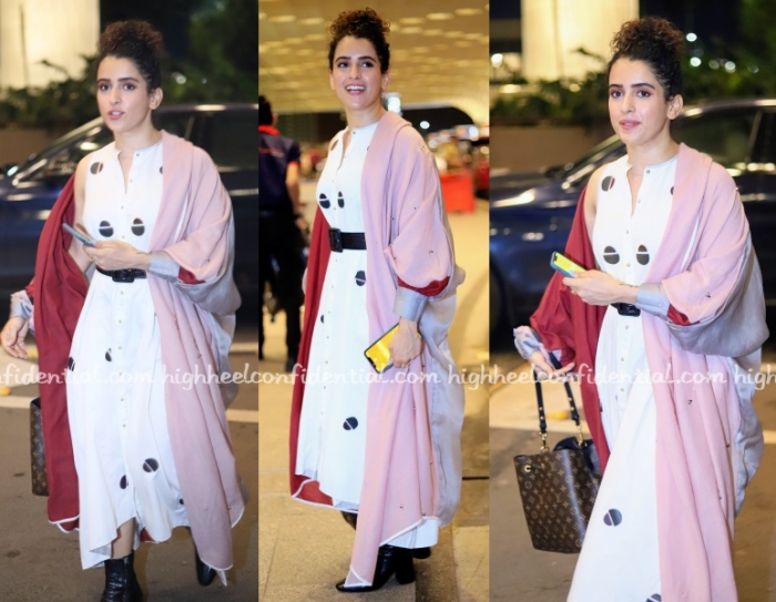 Sanya jetted out of Mumbai on Wednesday evening and was seen wearing a dress and coat from GRAINE with boots and a Louis Vuitton bag. Like the separates on her? I sure did.