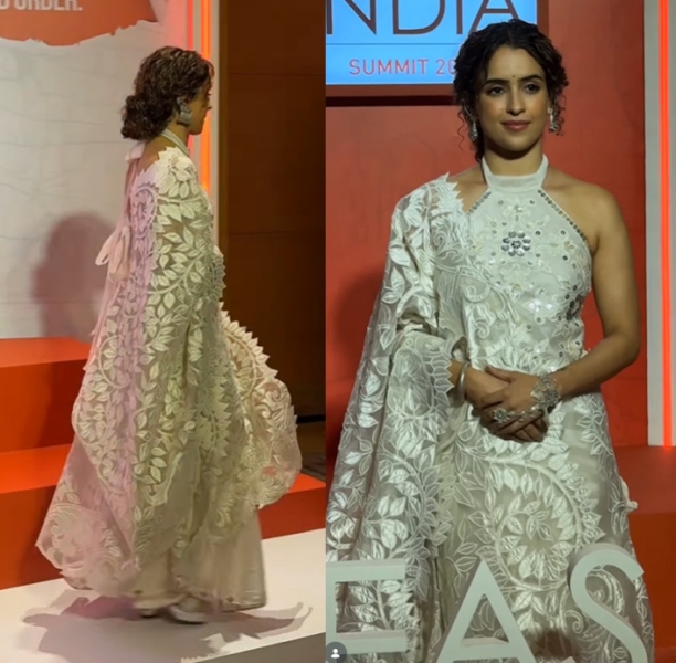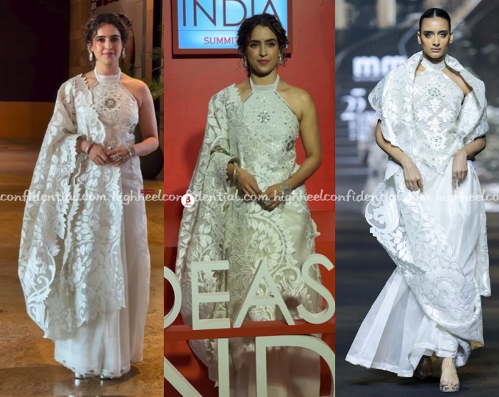 Sanya spoke at a summit on Saturday and was seen wearing a sari and halter top from Mohammed Mazhar with silver jewellery. The sari pallu was so intriciate that I liked that she wore it the seedha palla way so it could be highlighted.