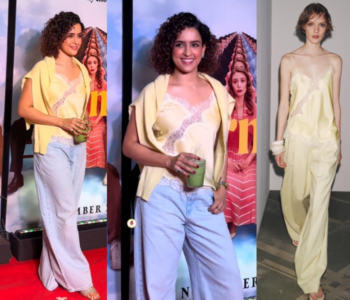 At the screening of a movie, Sanya was seen wearing a butter yellow silk camisole and cardigan set from Zara paired with denims. She looked nice in it.