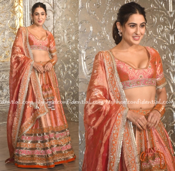 Sara was seen in an oranged toned brocade lehenga from Manish Malhotra at his Diwali bash. The lehenga was pretty but choli seemed way to tight at the bust going by the push up effect.
