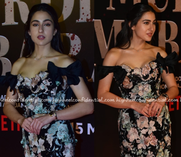 Sara attended the screening of her movie on Thursday wearing an off-shoulder floral gown from Marchesa. A delicate chain featuring letters spelling out Bambi and a Bvlgari serpenti watch finished out her look. She wore the gown well but I also think the gown was too formal a pick for a screening event.