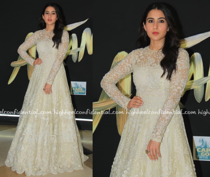 Sara attended the song launch of her movie wearing a beaded gown by Rahul Mishra. The workmanship on the gown is exquisite but somehow this look falls flat. I wish she’d added some contrasting neckpiece or worn her hair differently.