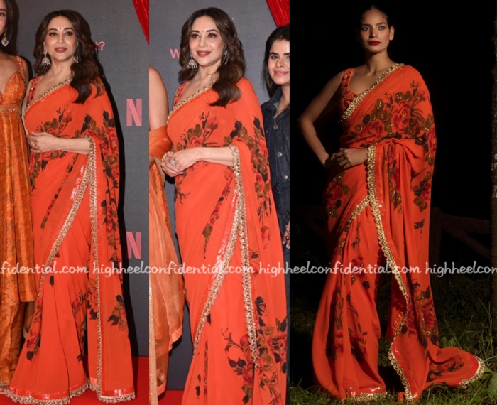 Madhuri attended the first look event of her upcoming OTT series wearing an orange hand painted sari from Baavli paired with jhumkis. Not much to fault. She wore it well.