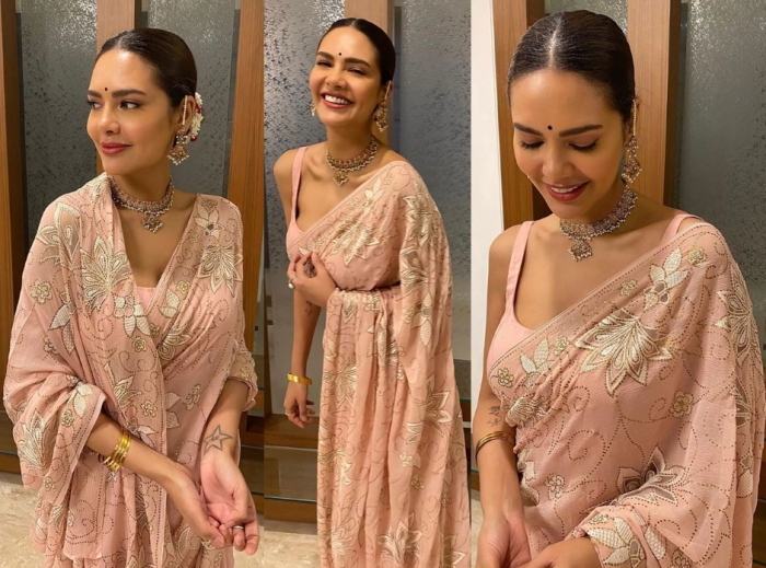 Esha shared pics of herself on social media today wearing a sari from her sister’s label, Ranian, with jadau jewellery. She looked nice.