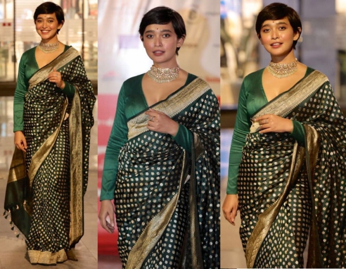 Sayani attended the opening ceremony of the IView Film Festival in Delhi a few weeks ago wearing a green Benarasi Coloroso sari with a choker from Tvisha Jewlz. While I love that she chose to wear a handwoven sari, can’t say that I loved that v-neck full sleeve top that she paired the sari with.