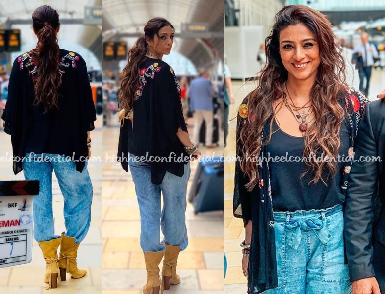 Tabu’s first look from her next movie was shared on social media recently in which she was spotted wearing an Umgee kimono with acid wash jeans and boots.