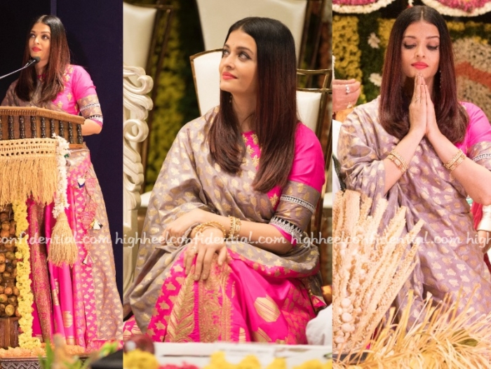 Over the weekend, Aishwarya helped inaugurate a cultural center representing the Bunt community in Pune where she was also felicitated with an award. At the event, where women mostly wore traditional, she opted for a pink and grey Masaba lehenga with a middle parted sleek do and gold bangles.