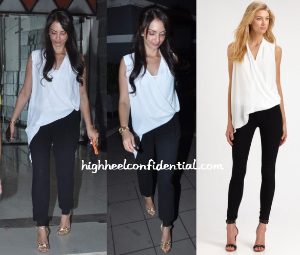 At a private bash, Seema was spotted in a BCBG top paired with black pants and ankle strap sandals. Yep, kind of like the model. 😛