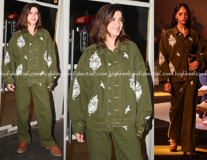At promotions for her movie Monday, Shanaya sported a green embroidered denim jacket and pants set from Huemn with tan chunky loafers. The relatively casual look made for a nice change from the gowns/dresses. She looked nice in it.