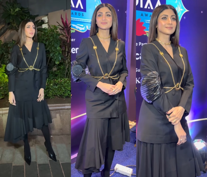 Shilpa attended an awards event on Wednesday evening wearing a blazer and asymmetrical skirt set with opaque pantyhose and pumps. Now, the all black look started out well but if she chose to wear that gold harness to make the look interesting, she shouldn’t have also added that Loewe bangle bag on the arm. All together, the look became a tad comical.