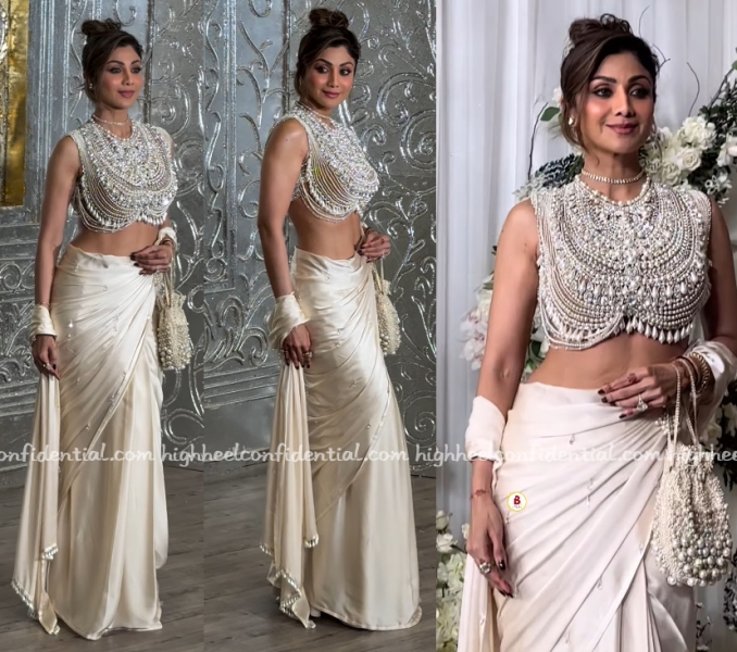 Shilpa wore a silk sari and pearl blouse set from Manish Malhotra draping the sari around her hands to show off the blouse. Shilpa tends to go overboard sometimes but I think she got it right here. She wore it well.