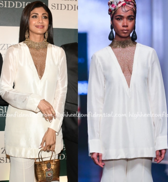 Shilpa attended the Iftar party on Sunday wearing a kurta and pant set from Anand Kabra featuring a mesh neck detail. I wish Ms. Shetty hadn’t gone the match-ey route here pairing the outfit with earrings and accessories and shoes with the same tone and let the neckline be the highlight of the outfit.