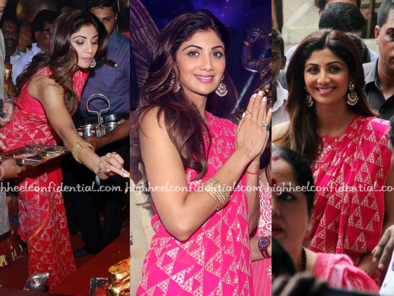 Shilpa attended a Ganesh Utsav mandal on Wednesday wearing a pink Anita Dongre sari. We don’t have better pics but from what we saw, we quite liked!