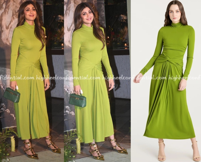 Shilpa attended a birthday party on Wednesday evening wearing a green dress from Cinq A Sept with her ostrich Loro Piana bag and gold Valentino sandals. The dress and bag pairing was nice but the shoes here, quite an eyesore.