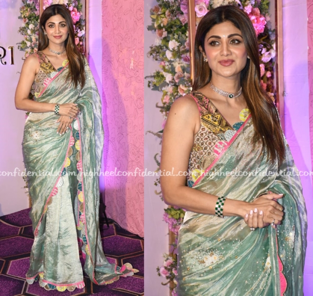 Shilpa was seen at a Navratri celebration in a sari from Raji Ramniq and I, for one, was glad that she didn’t go overboard on the jewellery/accessories. She looked lovely.