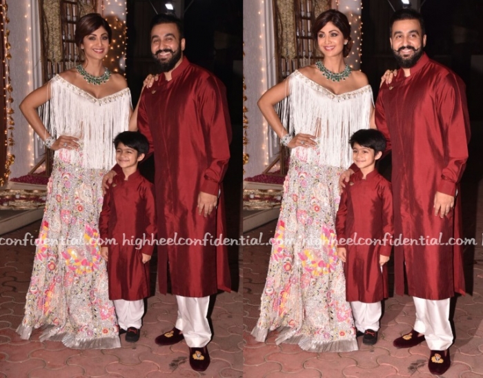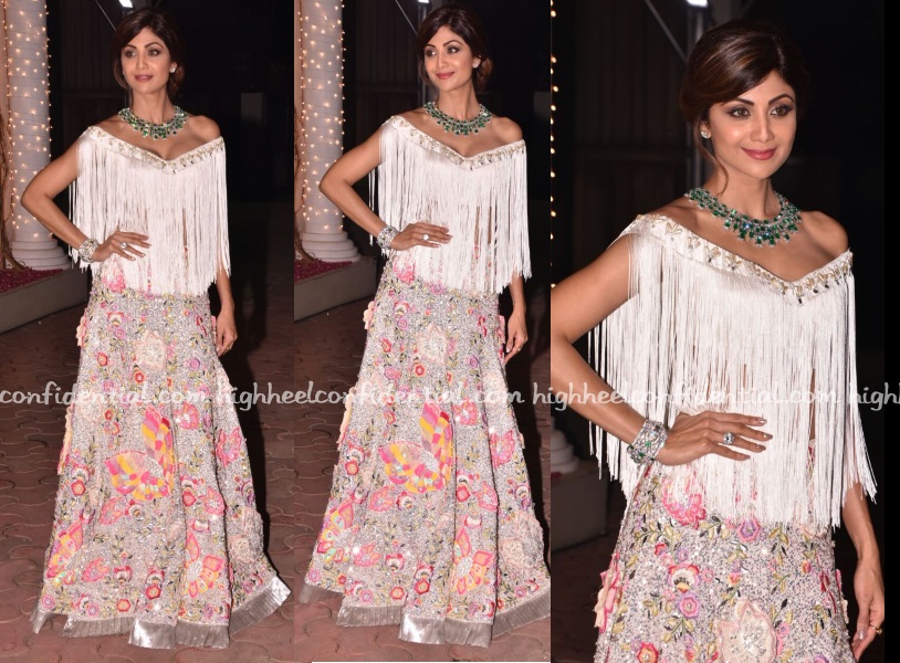 At her own Diwali party, Shilpa was seen in a Manish Malhotra lehenga and a statement emerald necklace. While I love the skirt, the necklace and the updo, the fringe choli just felt a bit overwhelming.
