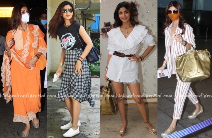 When not going super ott on her television show or red carpets, Shilpa tends to keep things fairly simple (most of the times anyway) with her off-duty appearances. Though she wears all of her separates well, if we were to pick one look from this recent round-up, her appearance in the striped separates/suit would have our vote!
