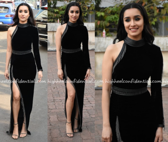 At the press meet of a new show, Shraddha was seen in a velvet one-shoulder gown from Aadnevik paired with ankle-strap sandals. She wore it well. You like?